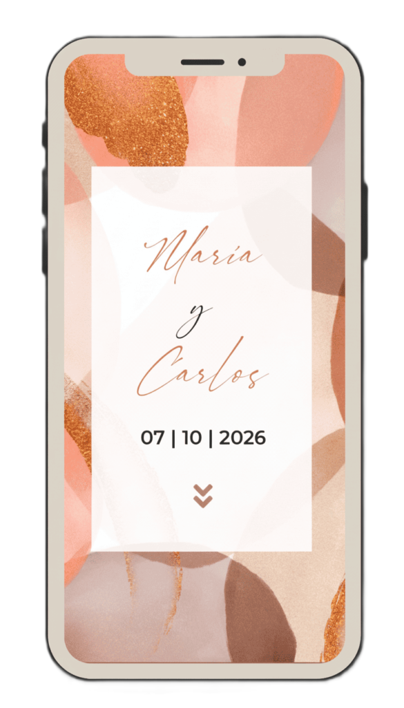 El Modelo Ocre destaca por su diseño sobrio y sofisticado, con tonos tierra y una estética minimalista. Es la elección perfecta para parejas que desean una invitación digital moderna y elegante. Personalizable con todos los detalles de vuestra boda, se adapta a celebraciones en entornos urbanos o en la temporada otoñal.